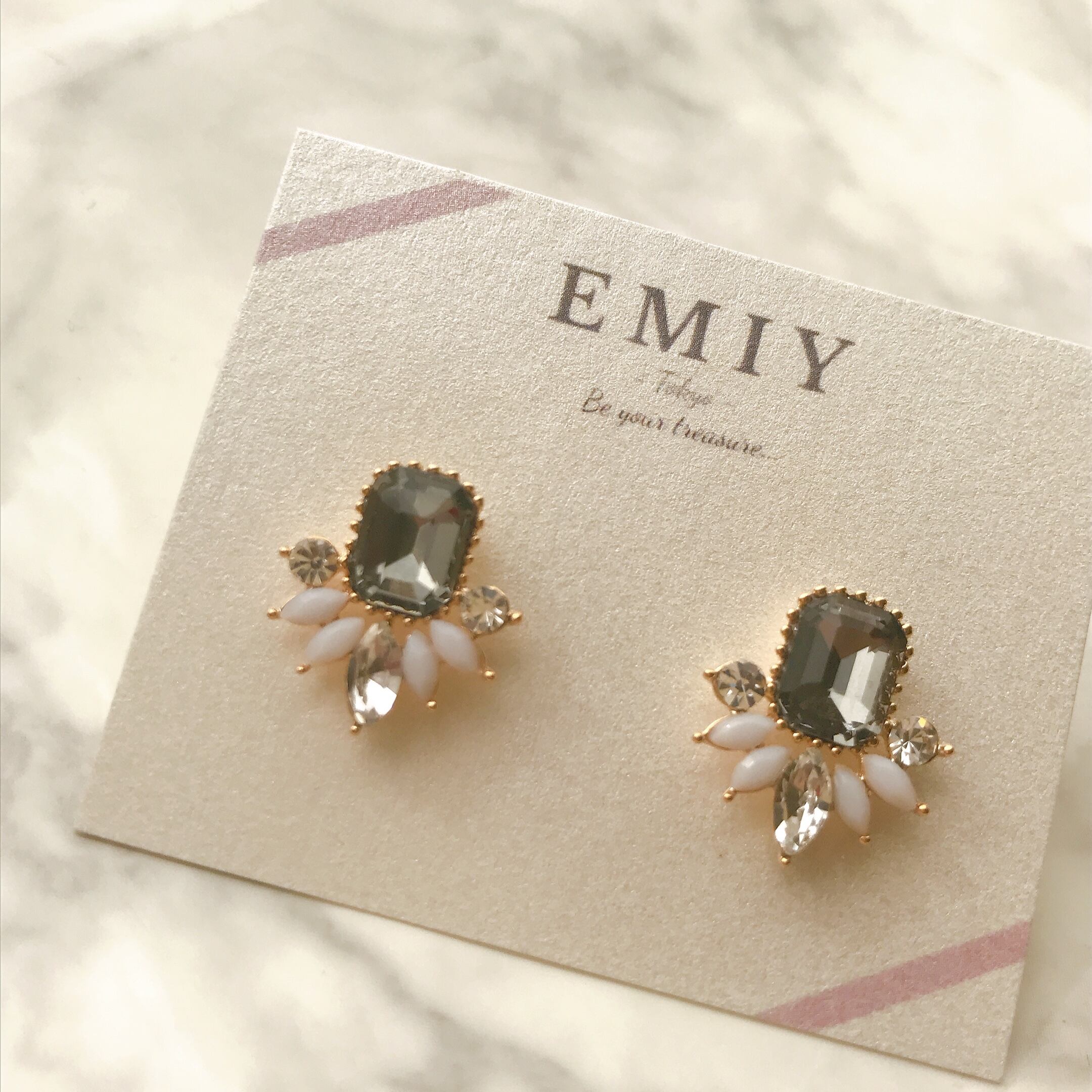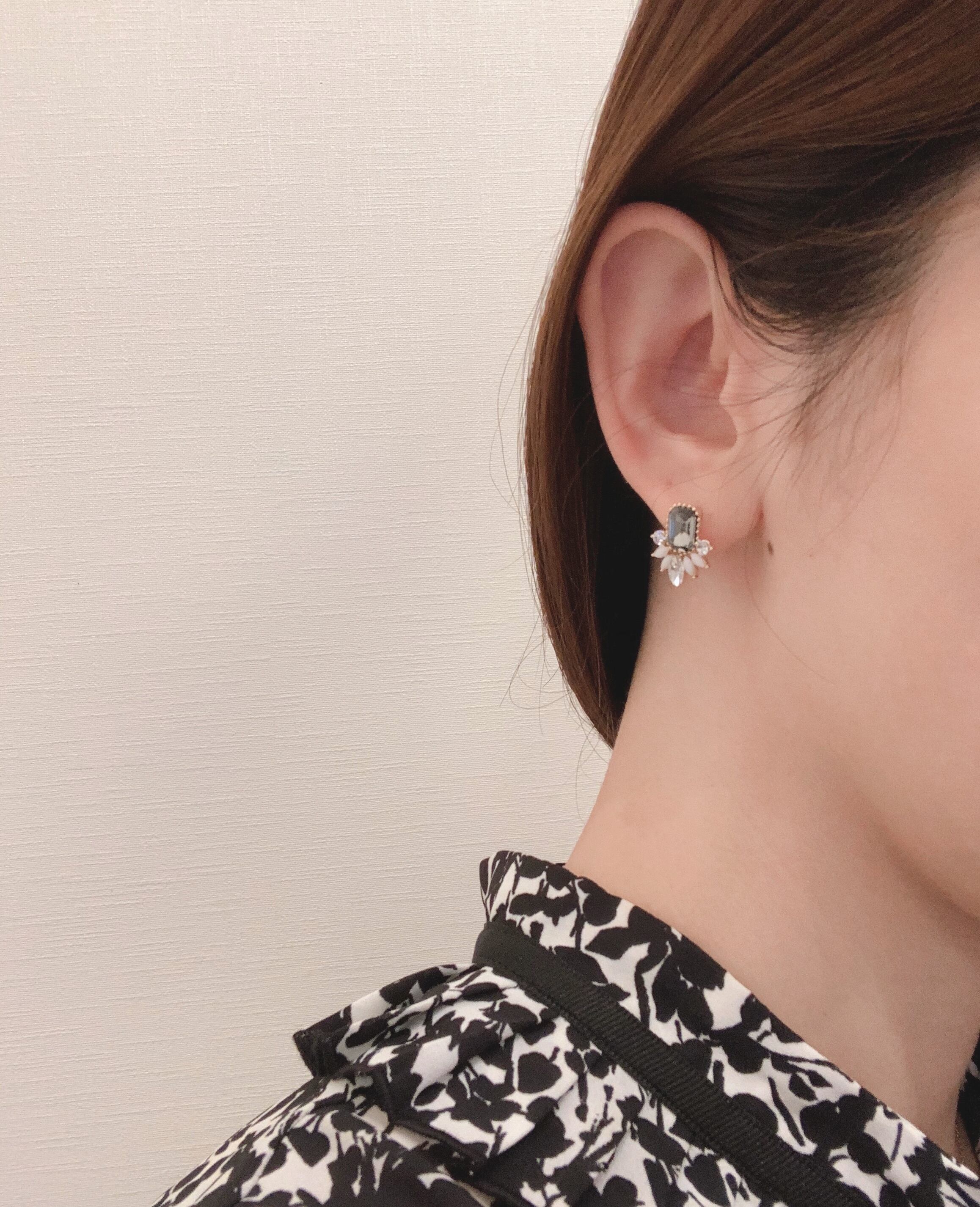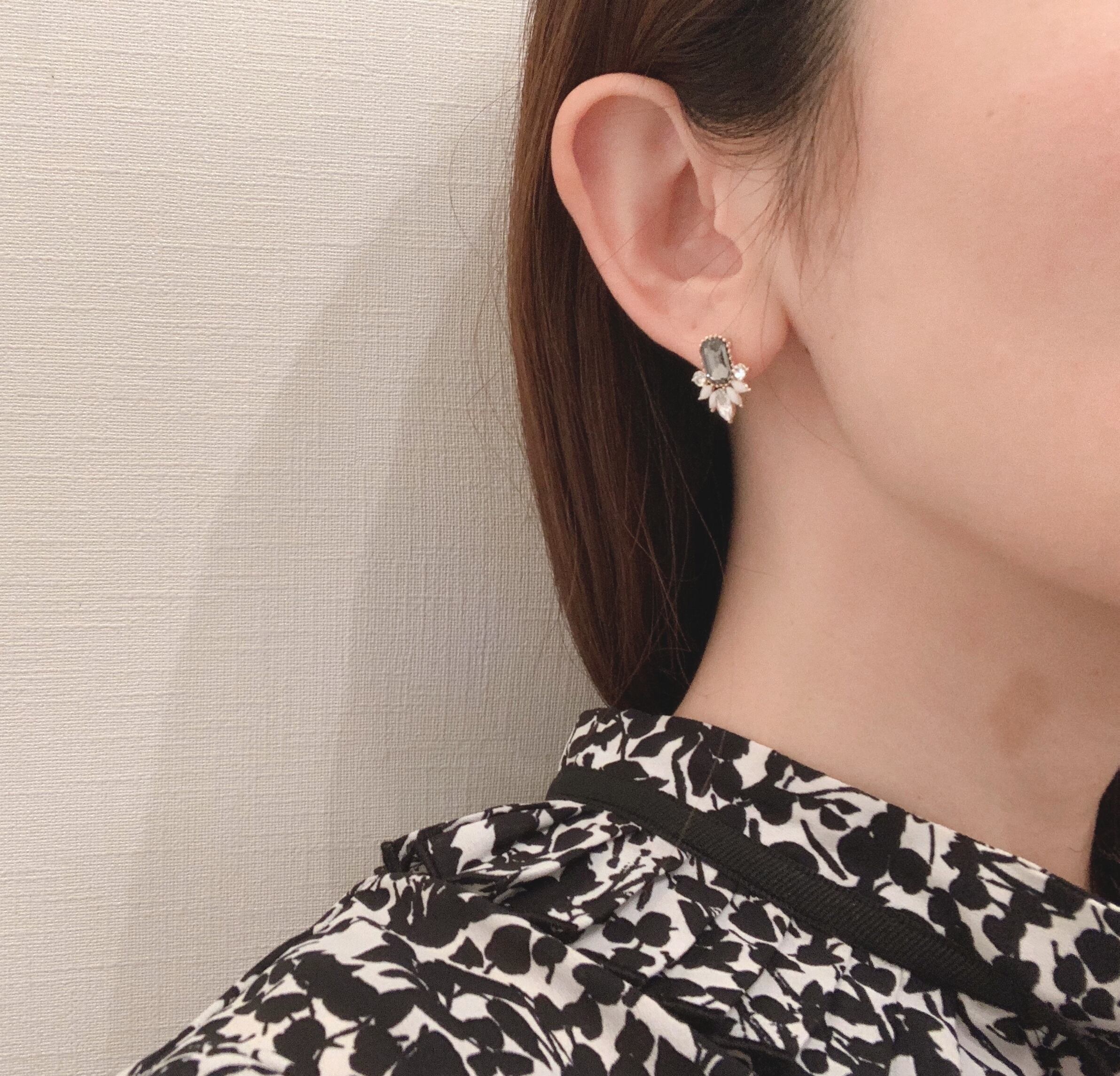 辛めのチャコールグレーのビジュー×甘め白とクリアビジューのピアス